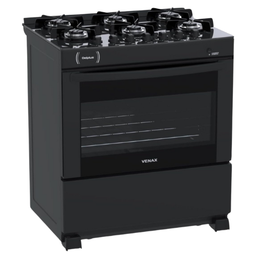 O Fogao 6 Bocas Venax Delplus vem com design moderno em vidro preto facilita a limpeza e oferece um visual sofisticado.
